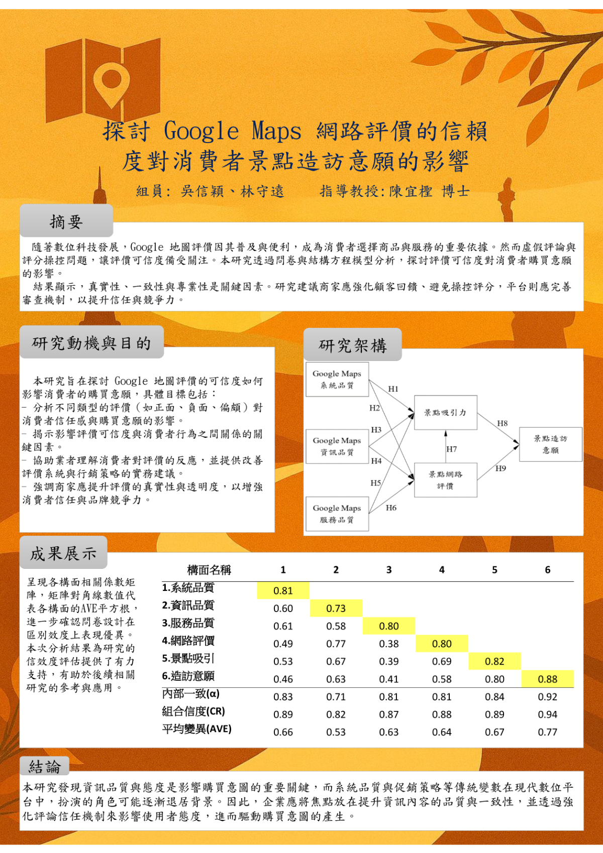 | Google Maps網路評價信賴對消費者景點造訪意願之研究:延伸資訊系統成功模型之理論觀點