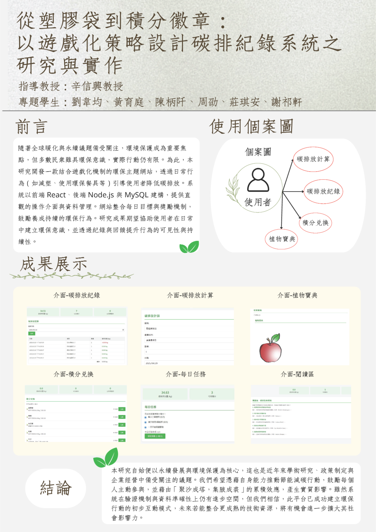 | 從塑膠袋到積分徽章:以遊戲化策略設計碳排紀錄系統之研究與實作