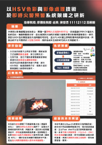 | 佳作 | 以HSV色彩與影像處理技術於即時火警預警系統架構之研析 | 呂若瑄 | 廖國良 |